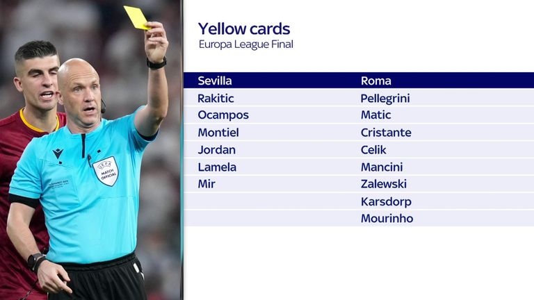 Sevilla won on penalties to condemn Mourinho to his first defeat in a European final after an ill-tempered match which saw British referee Taylor dishing out 14 yellow cards, the most ever in a Europa League game, and playing almost 30 minutes of stoppage time in total.